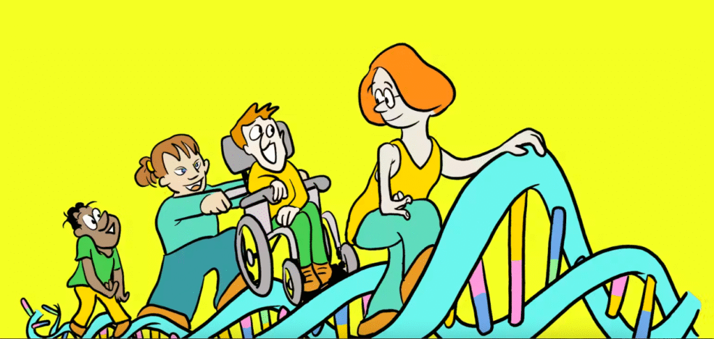 Een belangrijk argument om ernstige erfelijke ziektes uit ons embryo-DNA te knippen, is om een einde te maken aan het lijden dat zo’n ziekte met zich mee zou brengen. Wat vinden mensen met een aandoening hier zélf van? Cartoon: Frank Landsbergen. [ Lees het artikel ]